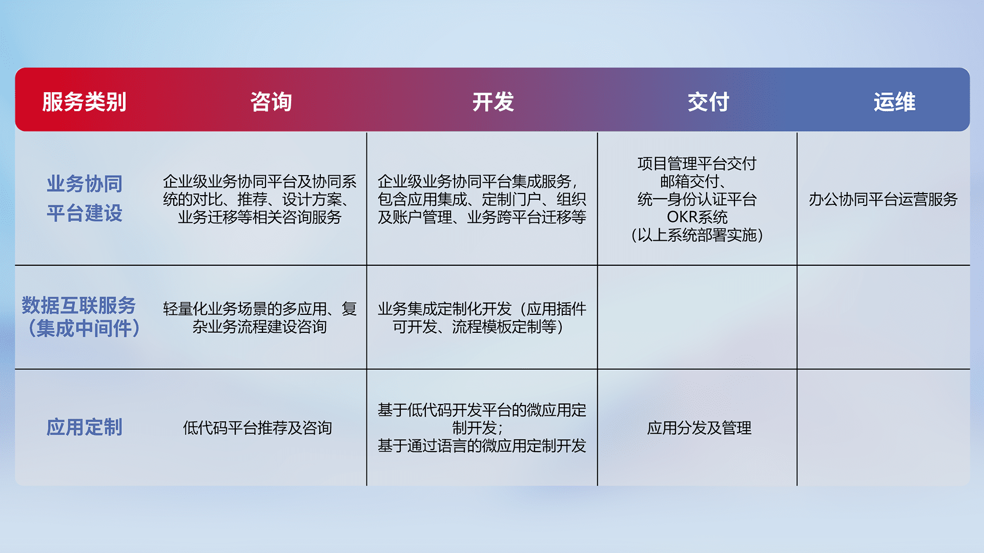 针对钉钉、、、企微、、、IDaas等平台级产品提供产品的规划、、方案、、、、交付、、、、定制化开发等服务,,,实现如统一协同办公、、、、智能客户服务、、、混合会议管理、、、、智能数据查询、、、、等业务场景,,,实现数字化转型。。。