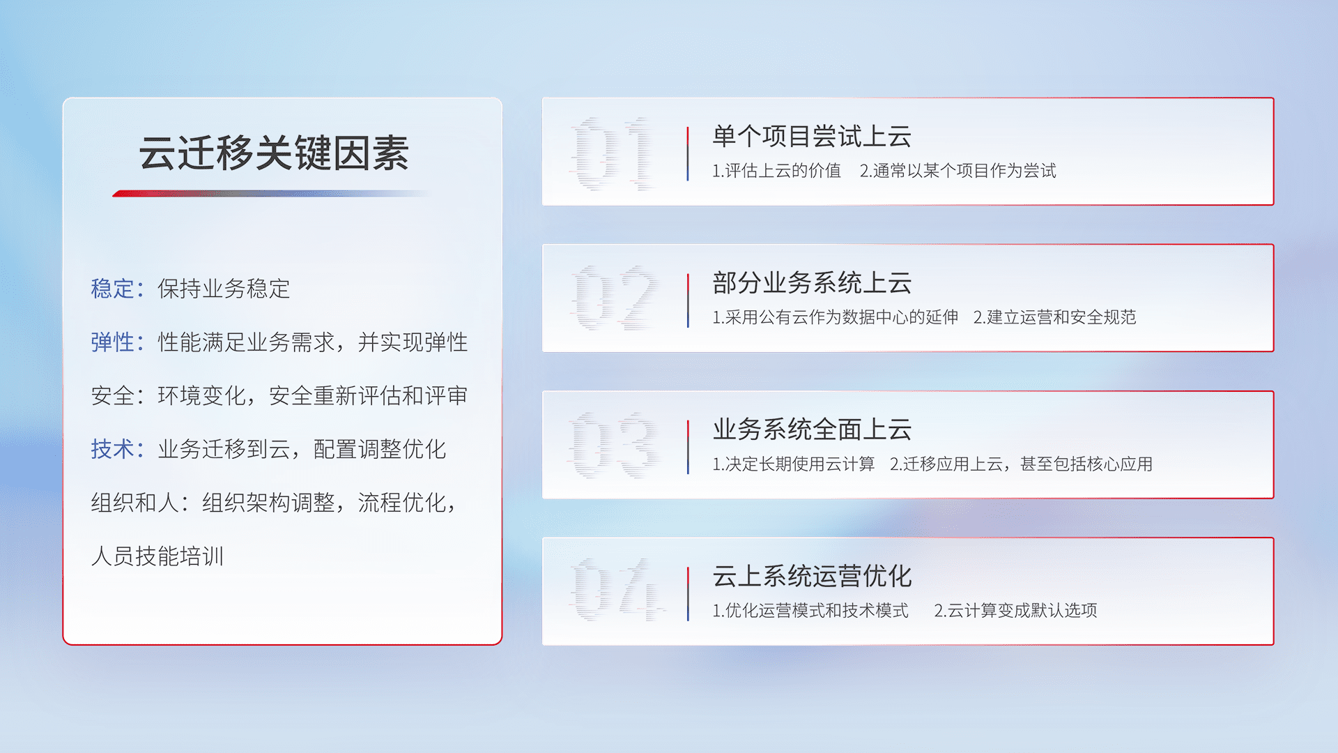 结合实际业务,,,从规划设计、、、云平台选型、、、云原生改造、、数据迁移、、、、集成交付,,,迁移全过程为客户识别最佳上云路径,,,做好风险识别管理,,,,设计网络架构、、、、身份权限、、、、安全审计合规、、操作审计、、、日志审计、、、、监控告警策略、、多站点容灾设计等,,,,对云上基础设施进行整体规划,,,,提升IT治理水平,,,,以满足弹性、、、高可用、、、高性能的需求。。