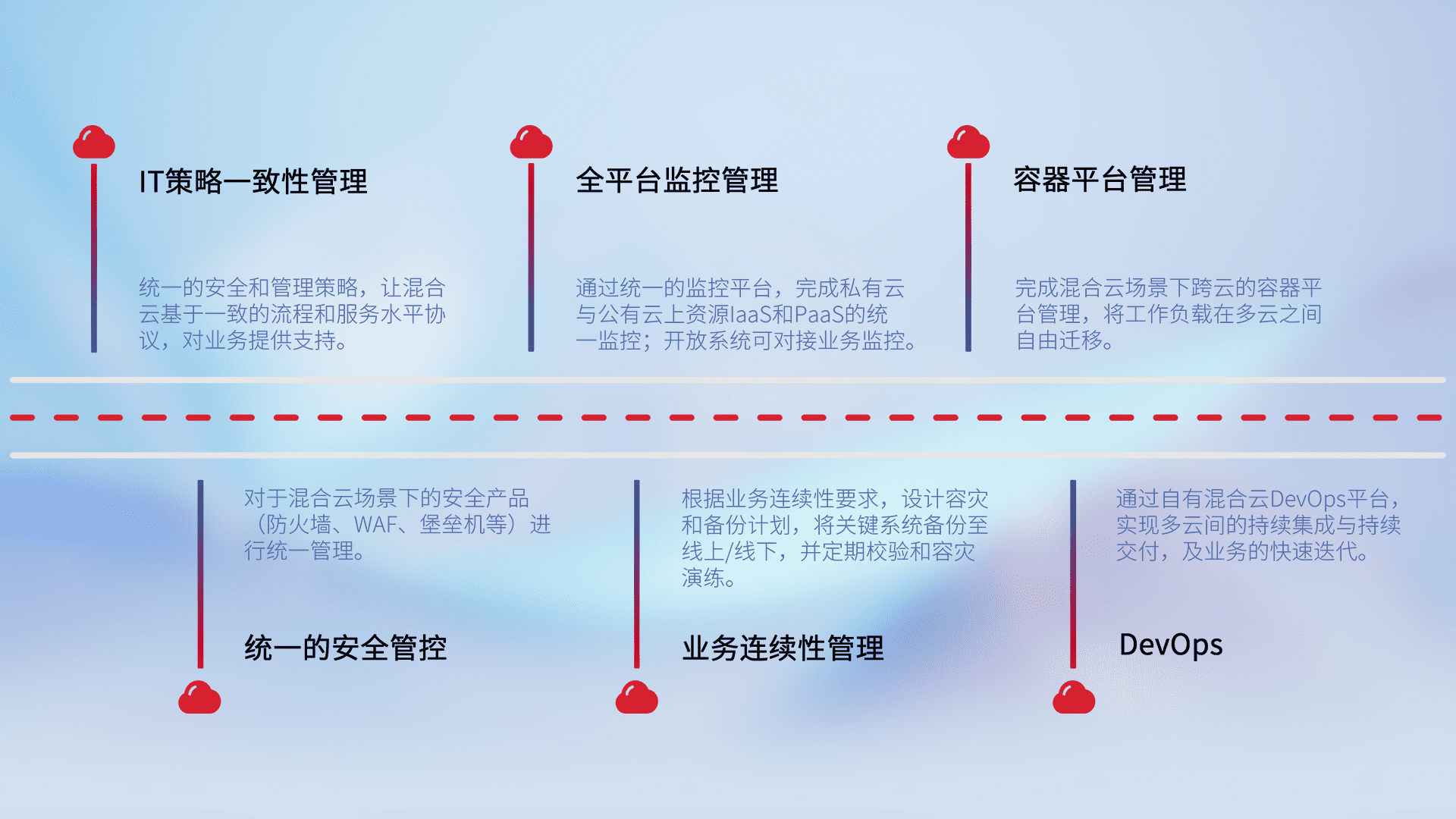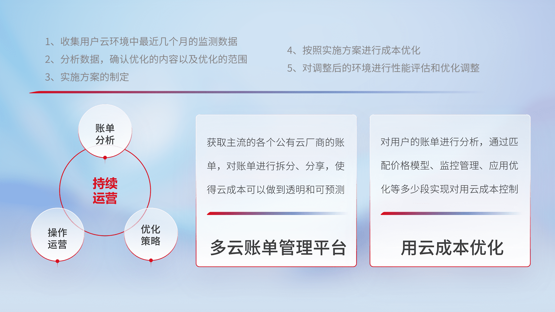 通过多云纳管,,,以统一的资源数据模型把客户的云资源进行抽象和封装,,,,进而实现对多云资源的统一操作,,,,保障云资源管理的可靠性、、、稳定性与可用性。。。。量身定制化运维内容,,配置、、、、开发运维、、补丁管理、、备份、、、、监控、、、认证和访问管理、、审计和日常巡检等,,保障在用云过程中的可靠度,,,稳定度以及高可用率。。。